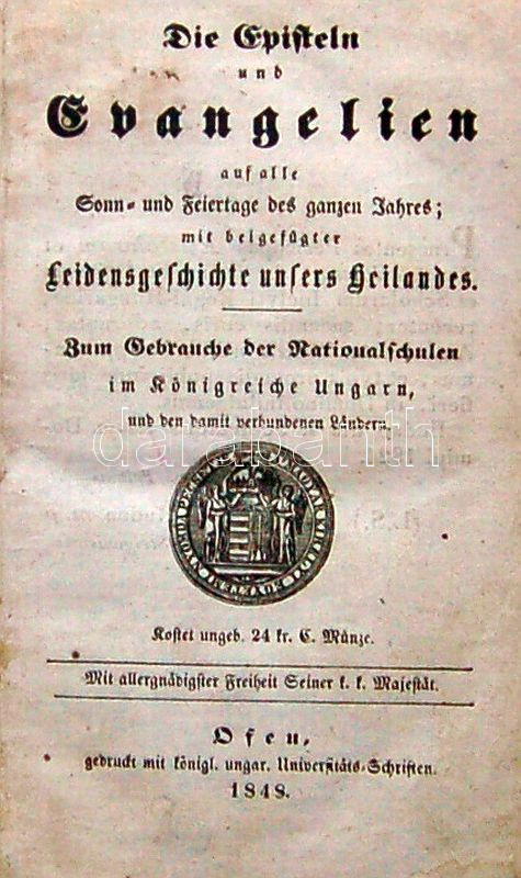Die Episteln und Evangelien auf alle Sonn- und Feiertage des ganzen Jahres; mit beilagter Liedensgeschickte unsers Heilander, Buda, Egyetemi nyomda 1848, 248 p. (korabeli papírkötésben ami néhol elvált)
