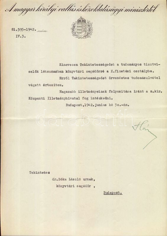 Beschreibung: 1942 Hómann Bálint vallás- és közoktatásügyi miniszter aláírása levélen