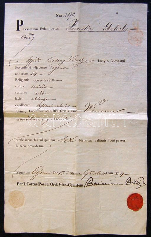 1834 Benjamin Bittó Pozsony Vármegye alispán által aláírt latin nyelvű... https://www.darabanth.com/de/125-Fernauktion/125.0/Andere-Sammelgebiete/~300125/1834-Benjamin-Bitto-Pozsony-Varmegye-alispan-altal-alairt-latin-nyelvu-utlevel-egy-varally~II347476