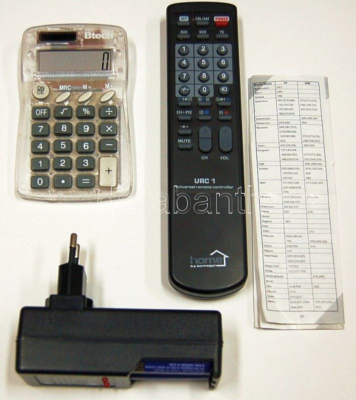 Beschreibung: Vegyes tétel, benne Home Somogyi URC1-es univerzális távvezérlő, elemtöltő akkuval illetve egy számológép (javításra szorul)