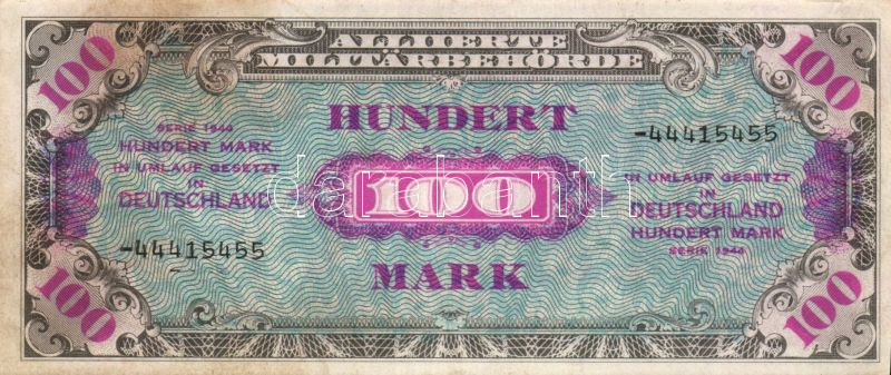 Beschreibung: Német 3. Birodalom / szövetséges megszállás alatt 1944. 100M USA-nyomat kilencjegyű sorszámmal T:I- foltos