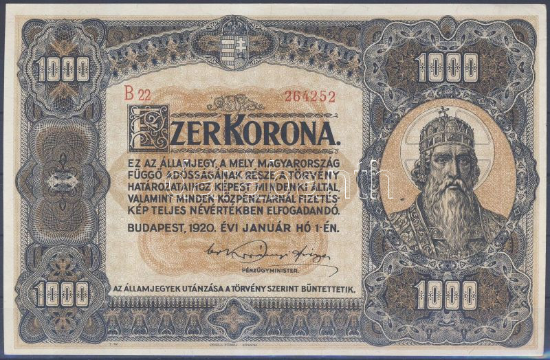 1920. 1000K T:I egyszer hajtva https://www.darabanth.com/de/127-Fernauktion/127.0/Numismatik/~500183/1920-1000K-TI-egyszer-hajtva~II354366