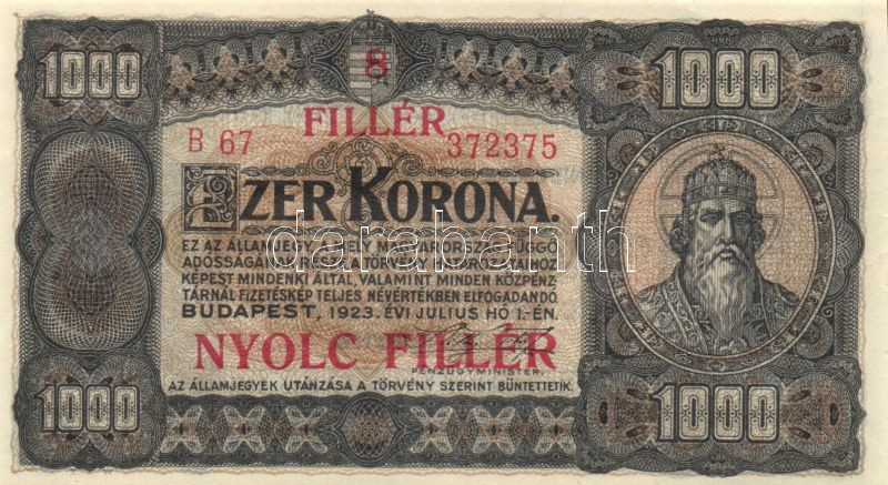 1923. 1000K piros "8 FILLÉR - NYOLC FILLÉR" felülbélyegzéssel T:I https://www.darabanth.com/de/127-Fernauktion/127.0/Numismatik/~500183/1923-1000K-piros-8-FILLER--NYOLC-FILLER-felulbelyegzessel-TI~II357811