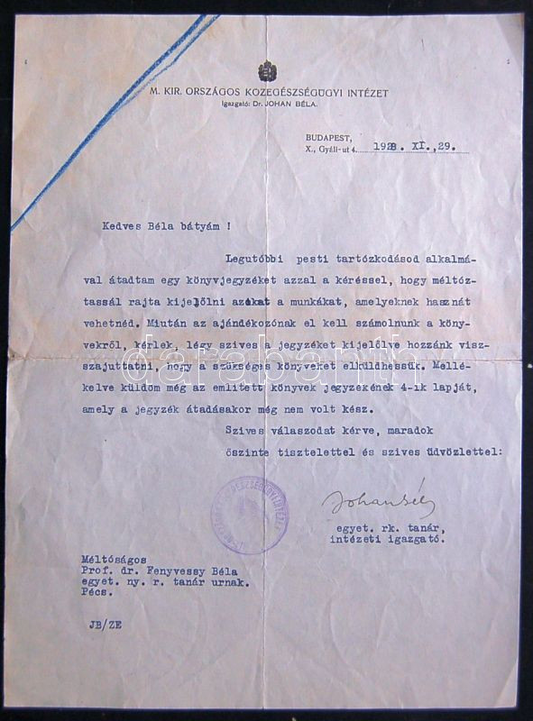 1928 Johan Béla orvos, belügyi államtitkár saját kézzel aláírt levele ... https://www.darabanth.com/de/128-Fernauktion/128.0/Andere-Sammelgebiete/~300147/1928-Johan-Bela-orvos-belugyi-allamtitkar-sajat-kezzel-alairt-levele-Dr-Fenyvessy-Bela-eg~II362609