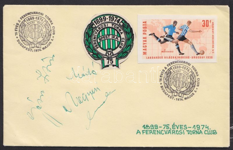 Beschreibung: 1974 75 éves az FTC boríték alkalmi bélyegzéssel, rajta Géczi, Máté, Megyesi aláírásával
