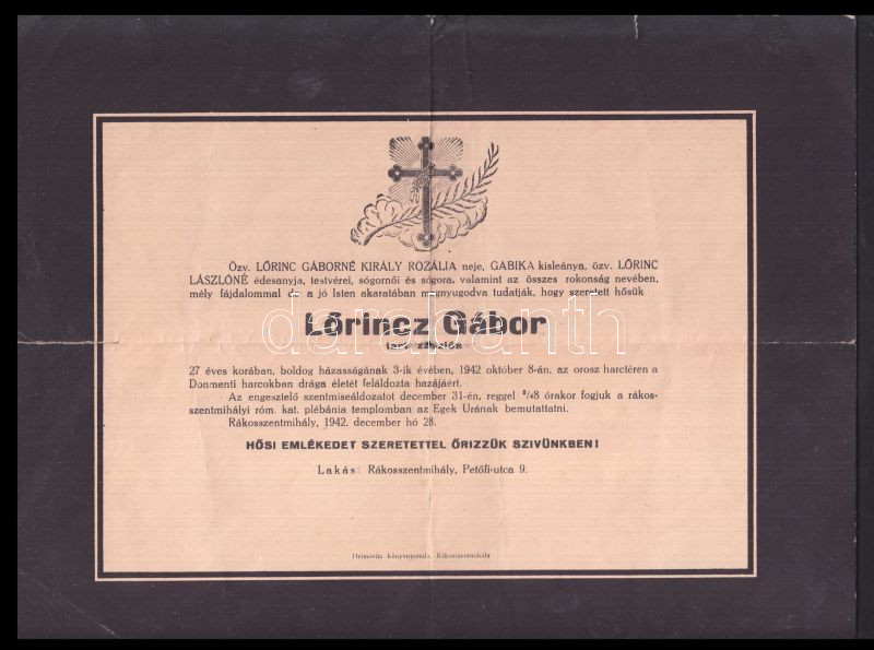 1942 Don kanyarban meghalt katona halotti értesítője (kissé viseltes) https://www.darabanth.com/de/128-Fernauktion/128.0/Andere-Sammelgebiete/~300157/1942-Don-kanyarban-meghalt-katona-halotti-ertesitoje-kisse-viseltes~II362621