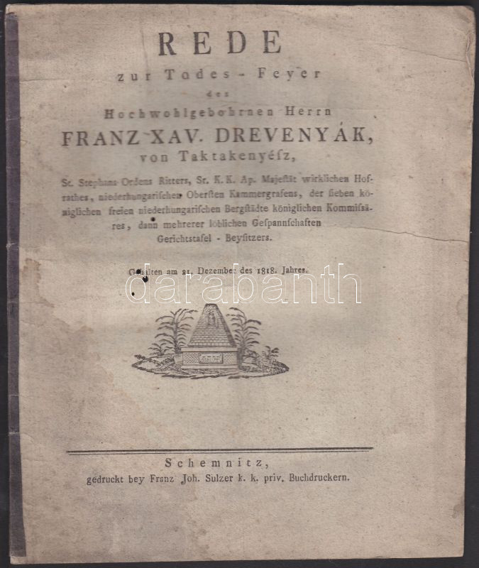 1818 Taktakenyészi Drevenyák Xavér Ferenc bányakamaragróf, a selmecbányai akadémia igazgatójának halotti beszéde német nyelven, Schemnitz, Joh. Sulzer nyomdája (5 apró lyuk) / The funeral-speech of duke Franz Xaver Drevenyak head of the Banská Štiavnica mining academy. 14p. (5 tiny holes)