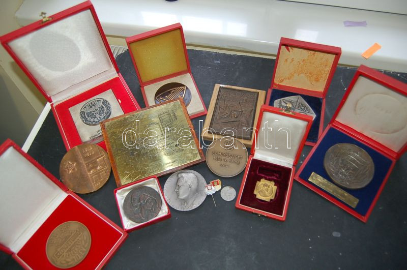 Beschreibung: Kis zacskónyi régi szocialista kitüntetések, plakettek és eredeti tokok T:vegyes