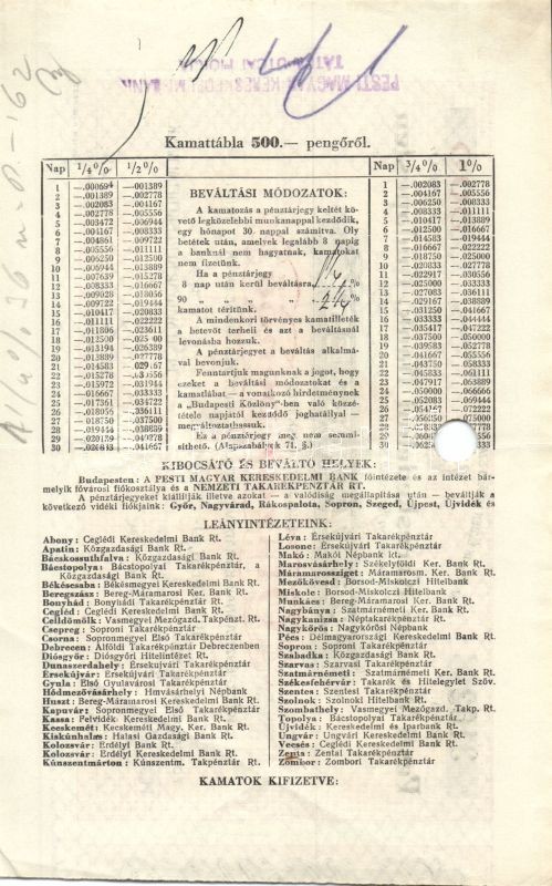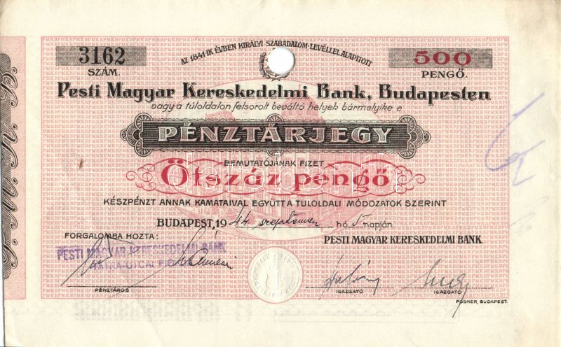 1944. A Pesti Magyar Kereskedelmi Bank pénztárjegye 500P-ről, lyukaszt... https://www.darabanth.com/de/128-Fernauktion/128.0/Philatelie/~300142/1944-A-Pesti-Magyar-Kereskedelmi-Bank-penztarjegye-500P-rol-lyukasztott-TII~II349942