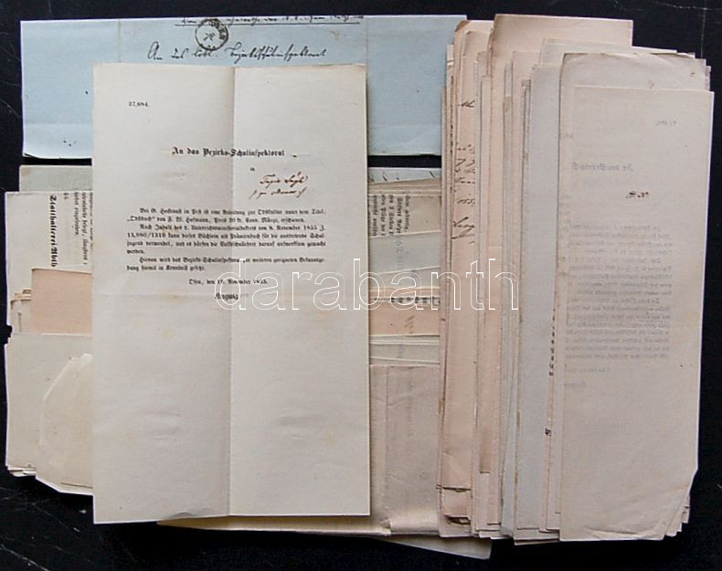 cca 1840-1880 Iskolaszéki iratok, bélyeg előtti levelek, nyomtatványok érdekességek latin, német és magyar nyelven, benne aláírásokkal is. Több száz darab érdekes irat szép állapotban megőrizve. Érdemes megnézni
