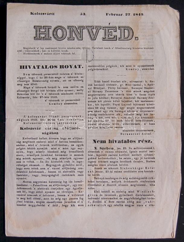 1849 a Honvéd c. kolozsvári lap február 27.-i száma a szabadságharc híreivel és Petőfi: Négy nap dörgött az ágyú c. versének első nyomtatott szövegével