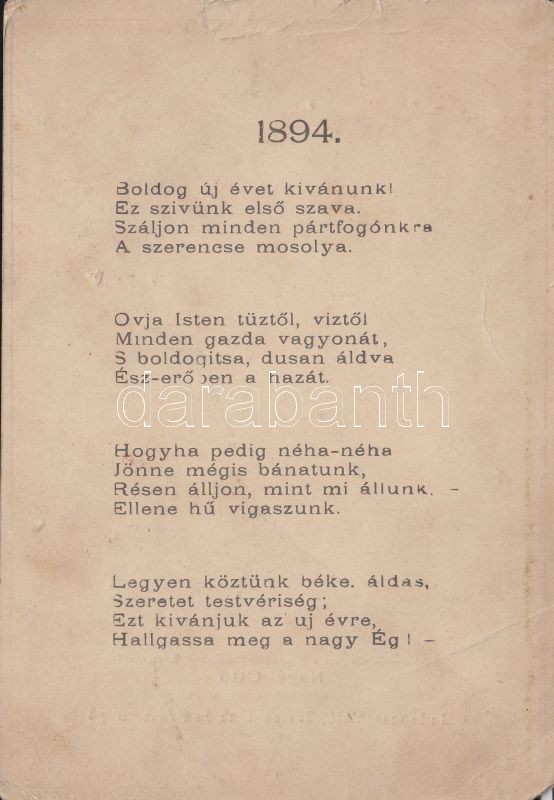 Beschreibung: 1894 Nagel Ottó kéményseprőmester ujévi litho üdvözlőkártya, Ulmann József, Bp. / Litho greeting card with a poem 11x16 cm (kis szakadás / small tear)
