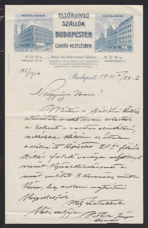1910 Hotel Adria és Hotel Rémi réznyomatos fejléces hotelszámla https://www.darabanth.com/de/130-Fernauktion/130.0/Andere-Sammelgebiete/~863/1910-Hotel-Adria-es-Hotel-Remi-reznyomatos-fejleces-hotelszamla~II370744
