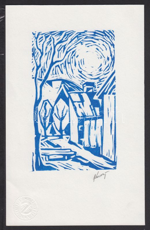 Beschreibung: Karancsi Sándor (1932-2003): Erdélyi falu, linómetszet-papír, jelzett 13x20 cm