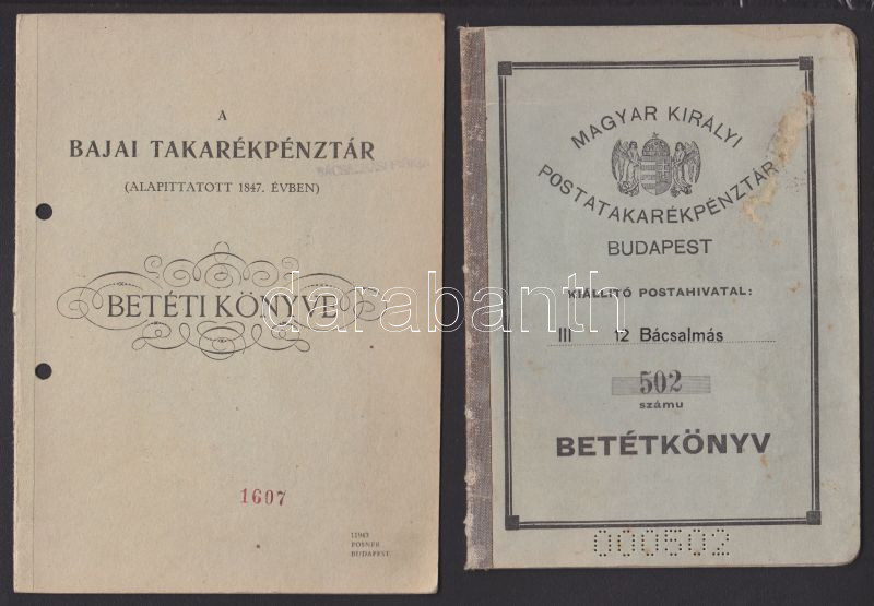Beschreibung: ~1940. Magyar Királyi Postatakarékpénztár Budapest (Bácsalmási kiállítás) + Bajai Takarékpénztár betétkönyvek T:II
