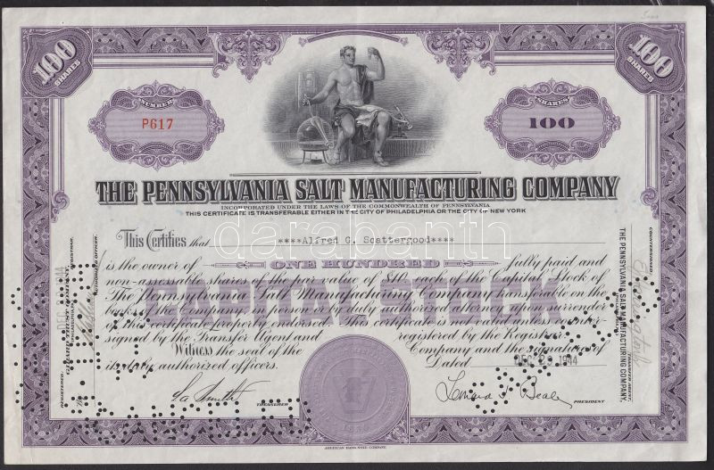 Beschreibung: USA 1944. Pennsylvaniai sógyár részvény "9.16.54 CANCELED" perforációval T:I-