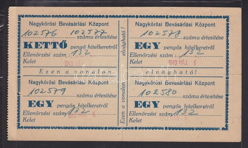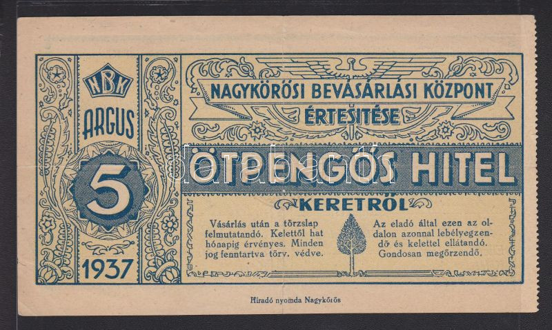 Beschreibung: 1937. Nagykőrösi Bevásárlási Központ 5P hitel keretről T:II szakadt hajtás