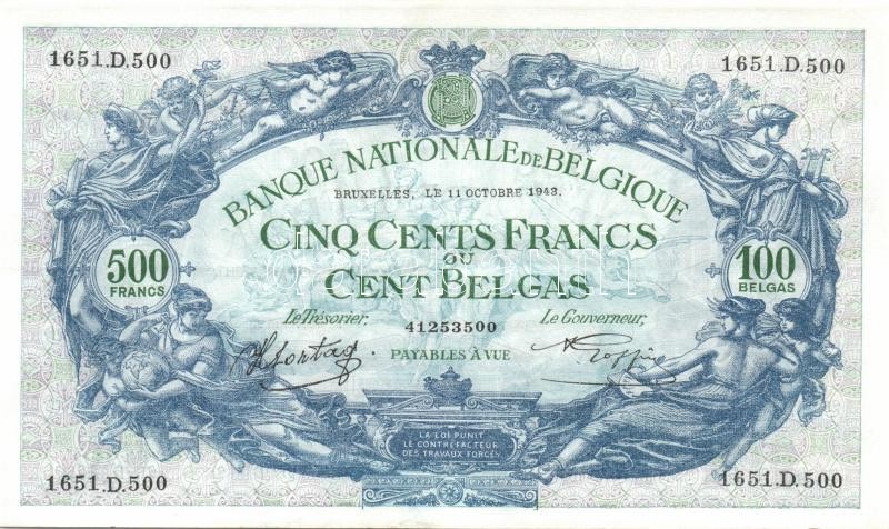 Beschreibung: Belgium 1943.10.11. 500Fr/100B (2x) egymásutáni sorszámmal T:II+ Csak egyszer hajtva!