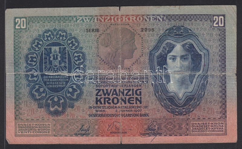 1907. 20K T:IV hátoldal ragasztva https://www.darabanth.com/de/130-Fernauktion/130.0/Numismatik/~875/1907-20K-TIV-hatoldal-ragasztva~II368055