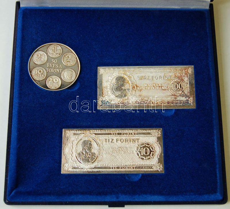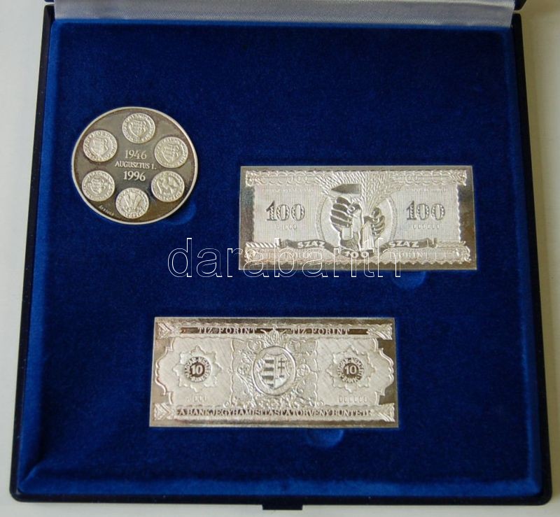 DN 1946-os 10Ft-ost formázó Ag emlékplakett T:PP 46,7g + DN 1946-os 100Ft-ost formázó Ag emlékplakett T:PP 45,7g + 1946-1996. Augusztus 1. "50 éves a forint" Ag emlékérem 31,5g T:PP eredeti díszdobozban
