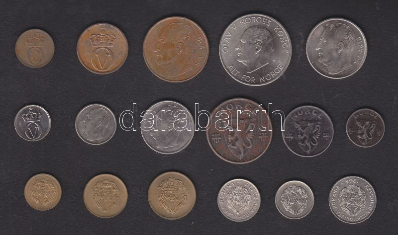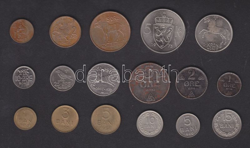 Norvégia 1943-73 1ö (2x),2ö (2x),5ö (2x),10ö,25ö,50ö,1K,5K + Románia 1952-66 1B,3B,5B (2x),10B,15B T:1,2,3