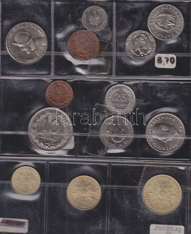 Uruguay 1969. 1P, 5P, 10P + El Salvador 1970-72. 1c, 5c, 10c, 25c, 50c + Panama 1c, 2 1/2c, 5c, 1/10B , 1/4B, T:1,2