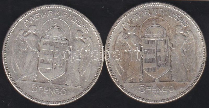 1930 5P Ag "Horthy jobbra" 2x T:3 https://www.darabanth.com/de/130-Fernauktion/130.0/Numismatik/~885/1930-5P-Ag-Horthy-jobbra-2x-T3~II371073