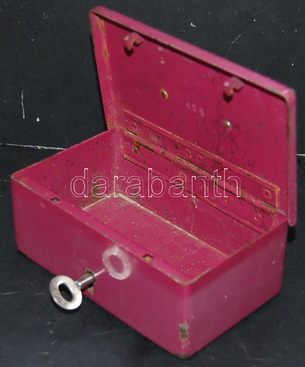 Beschreibung: Fém pénzkazetta működő zárral 14x8x5cm-es méretben, kissé megkopva