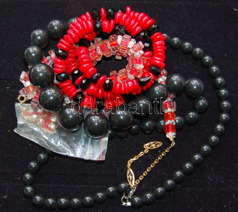 Beschreibung: Kis bizsu tétel: Korall, bakelit és velencei üveg nyaklánc + 1 fülbevaló