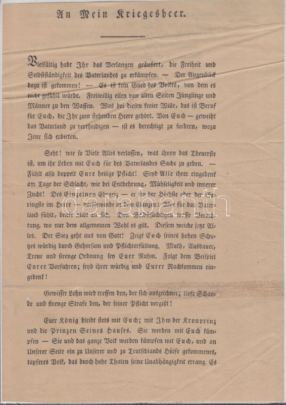 1813 III. Frigyes Vilmos porosz király kiáltványa hadvezéreihez a Napóleon elleni hadüzenet előestéjén (egy szakadás)/ Declaration of Friedrich Wilhelm king of Prussia on the forthnight of the war against Napoleon (one tear) 21x30 cm