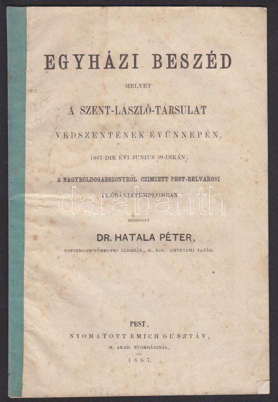 Beschreibung: Egyházi beszéd melyet a Szent-László társulat védszentének évünnepén mondott Dr. Hatala Péter, 1867, Pest, Emich Gusztáv 16p.