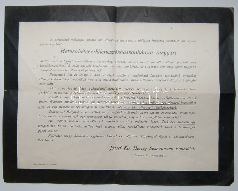 cca 1916 József szanatórium TBC ellenes propaganda gyászjelentés formá... https://www.darabanth.com/de/131-Fernauktion/131.0/Andere-Sammelgebiete/~400205/cca-1916-Jozsef-szanatorium-TBC-ellenes-propaganda-gyaszjelentes-formajaban-Anti-TBC-propaga~II374444