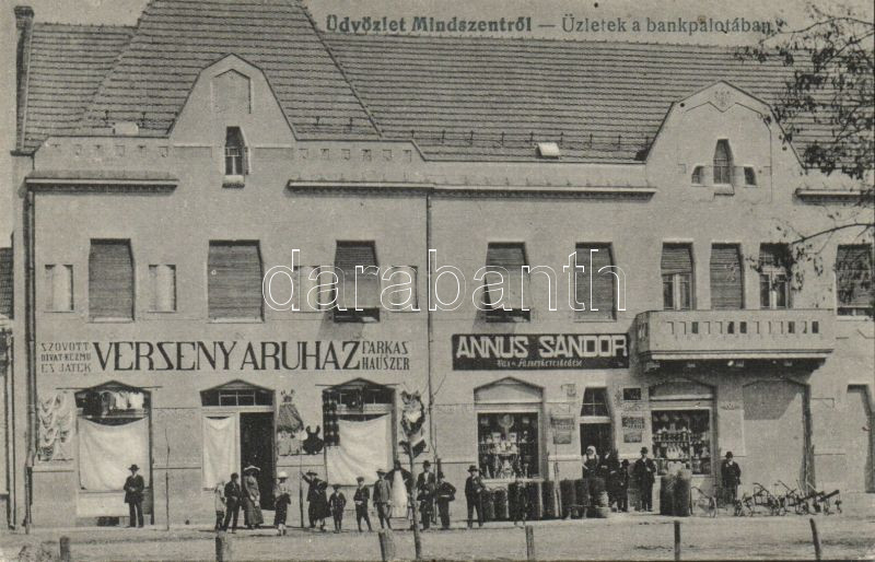 Beschreibung: Mindszent Bankpalota a Verseny Áruházzal és Annus Sándor vas- és fűszerkereskedésével