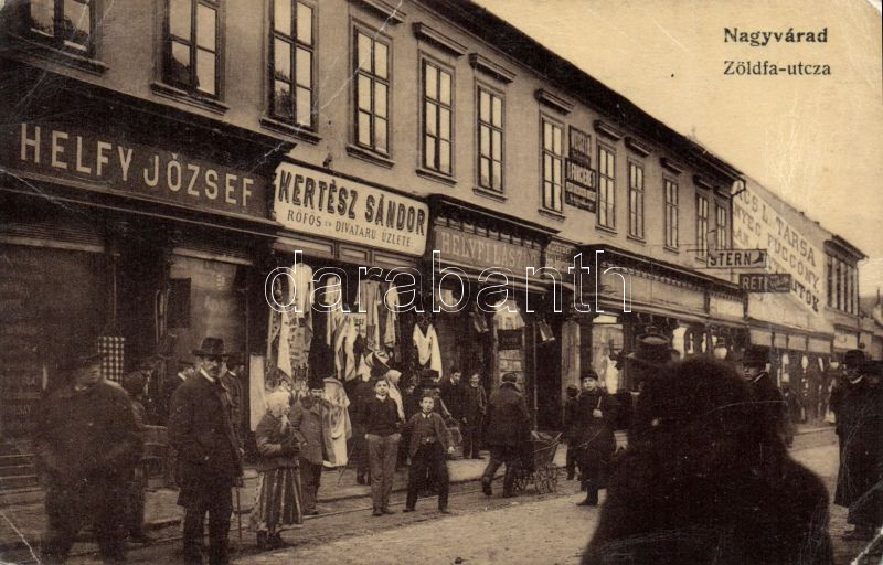 Nagyvárad Zöldfa street with the shops of József Helfy, Sándor Kertész... https://www.darabanth.com/de/131-Fernauktion/131.0/Ansichtskarten/~400005/Nagyvarad-Zoldfa-street-with-the-shops-of-Jozsef-Helfy-Sandor-Kertesz-and-Laszlo-Helyfi-b~II372818