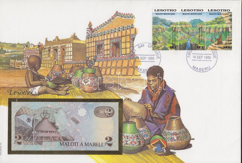 Lesotho 1989. 2M dekoratív, nagyalakú bankjegyes, bélyeges borítékon, ... https://www.darabanth.com/de/131-Fernauktion/131.0/Numismatik/~400161/Lesotho-1989-2M-dekorativ-nagyalaku-bankjegyes-belyeges-boritekon-belyegblokkal-elsonapi~II373059