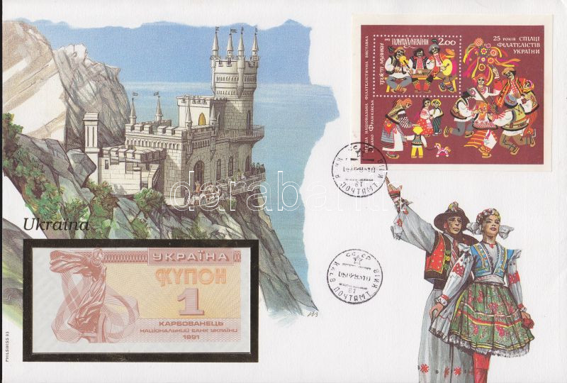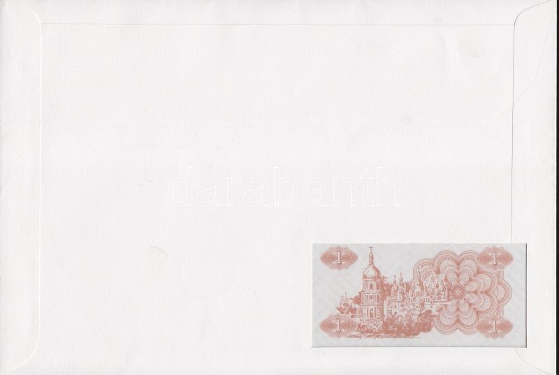 Beschreibung: Ukrajna 1991. 1K dekoratív, nagyalakú bélyeges, bankjegyes borítékon, bélyegblokkal, alkalmi bélyegzővel T:I