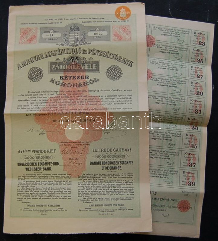 1910. A Magyar Leszámítoló ás Pénzváltóbank záloglevele 2000K-ról https://www.darabanth.com/de/131-Fernauktion/131.0/Numismatik/~400162/1910-A-Magyar-Leszamitolo-as-Penzvaltobank-zaloglevele-2000K-rol~II371679
