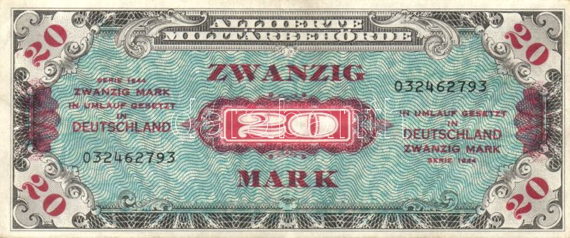 Beschreibung: Német 3. Birodalom / szövetséges megszállás alatt 1944. 20M USA-nyomat kilencjegyű sorszámmal T:III