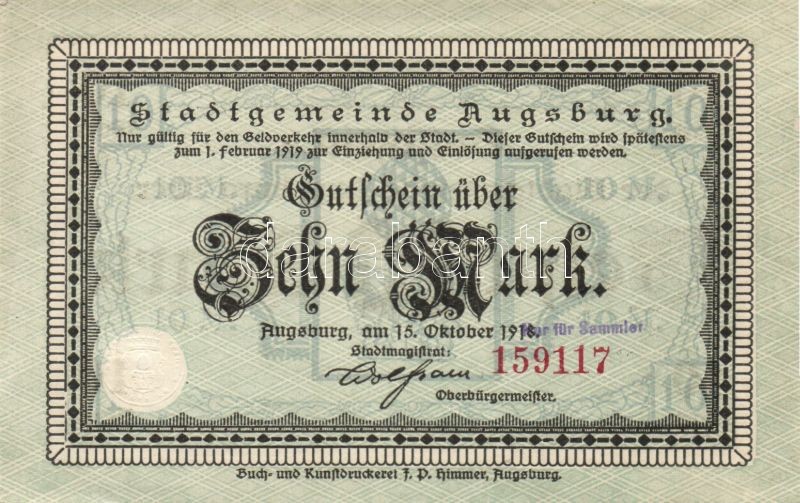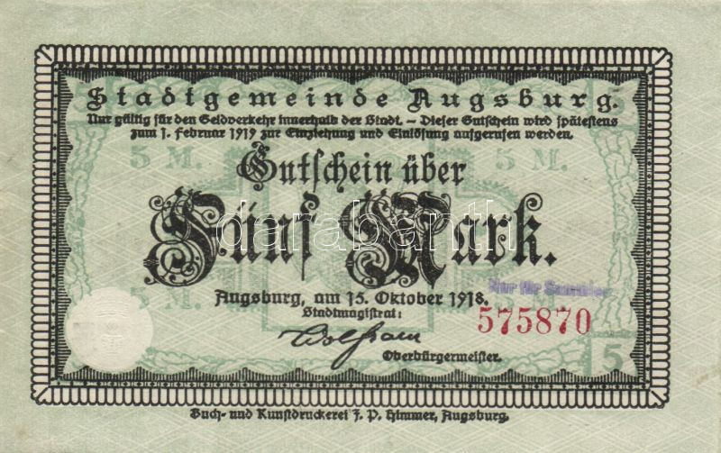 Beschreibung: Német Birodalom/Császárság/Augsburg 1918.10.15. 5M, 10M hivatalos érvénytelenítéssel T:I,I-