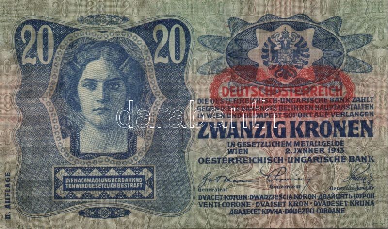 1913. 20K (3x) II.kiadás piros vízszintes "Deutschösterreich" felülbé... https://www.darabanth.com/de/131-Fernauktion/131.0/Numismatik/~400165/1913-20K-3x-IIkiadas-piros-vizszintes-Deutschosterreich-felulbelyegzessel-egymas-utan~II373649