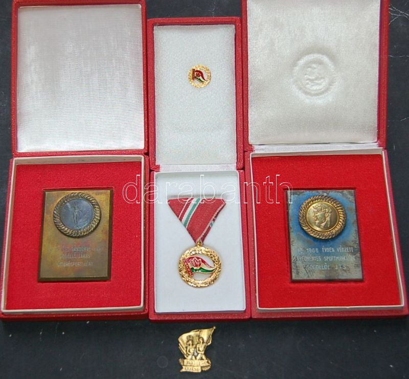 Beschreibung: 1968 "Eredményes sportmunkáért" 2 db plakett eredeti díszdobozban + úttörő kitüntetés miniatürrel, szalaggal, + MHK jelvény díszdobozban T:1-2/3