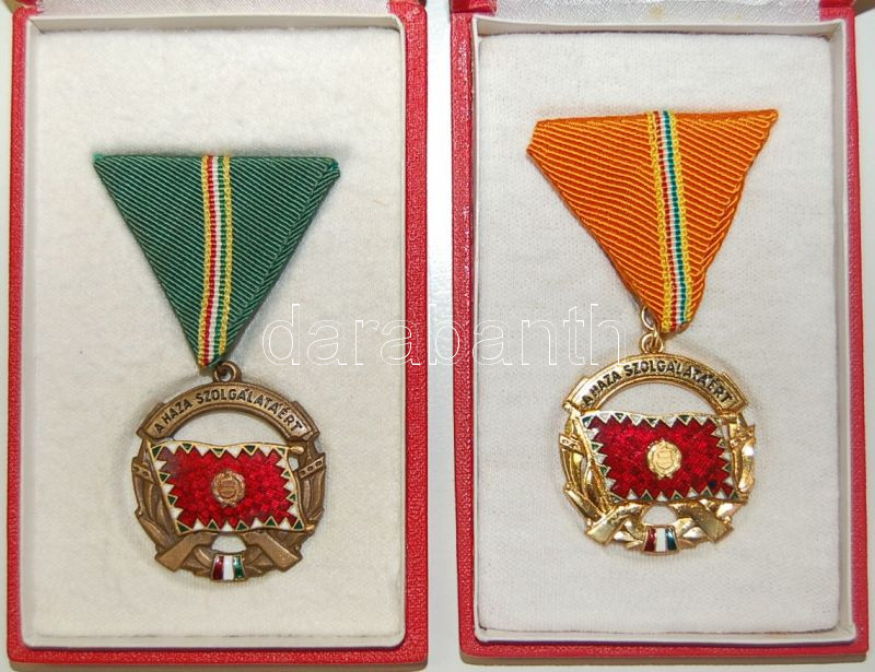 Beschreibung: A Haza Szolgálatáért Érdemérem arany és bronz fokozata, szalaggal T:1/2 Eredeti díszdobozban!