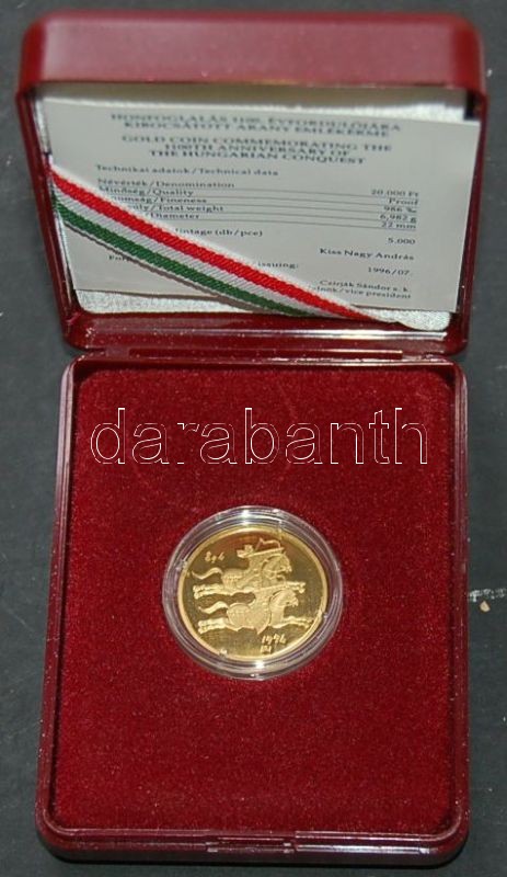 1996. 20.000Ft Au "Honfoglalás" 6,982g T:PP Csak 5000db! Díszdobozban,... https://www.darabanth.com/de/131-Fernauktion/131.0/Numismatik/~400171/1996-20000Ft-Au-Honfoglalas-6-982g-TPP-Csak-5000db-Diszdobozban-tanusitvannyal~II371914