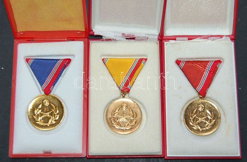Beschreibung: DN "Honvédelmi Érdemérem-10,15,20 éves" 3 db kitüntetés, szalaggal T:1/2 Díszdobozban!