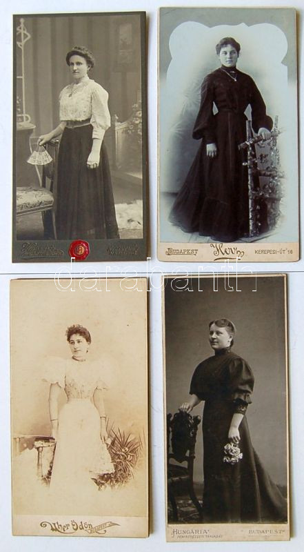 Beschreibung: Divat: 4 db nagyméretű keményhátú fotó ritka magyar fényképészek műtermeiből / Fashion: 4 vintage photos