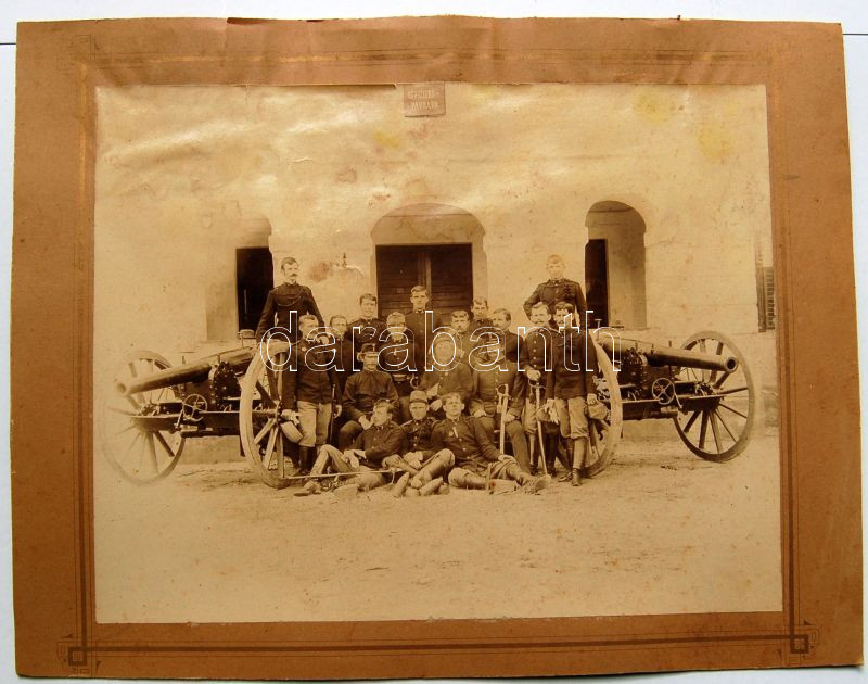 XIX. sz vége: Magyar helyőrségi tisztek nagyméretű tablófotója a laktanya előtt (a keménypapír kissé ázott) / k.u.k. officers large photo (cartboard wet) 39x30 cm