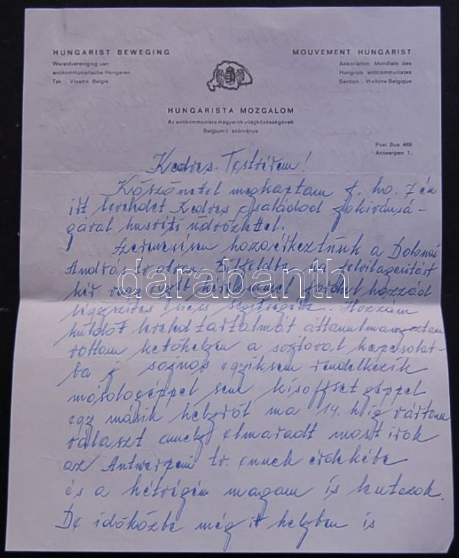 Beschreibung: Vajda József emigráns hungarista vezető saját kézzel írt levele