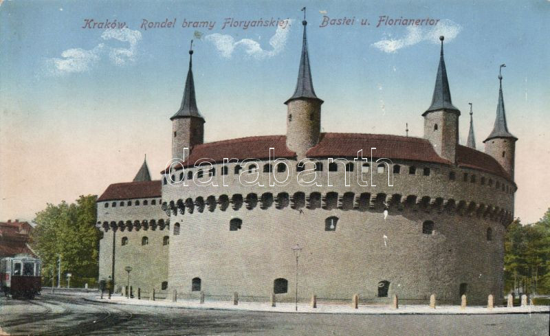 Krakow Rotunda by Florian gate with tram https://www.darabanth.com/de/133-Fernauktion/133.0/Ansichtskarten/Polen~400038/Krakow-Rotunda-by-Florian-gate-with-tram~II380388