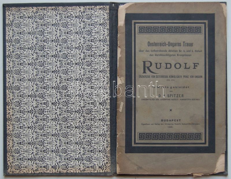 1889 Spitzer rabbi: Rudolf trónörökös gyászbeszéde, Budapesti kiadás, 26p. az ezüstözött egészvászon borító szép állapotban, a papírkötésű nyomtatvány megviselt / Mourning speech of Rudolph heir of the Austro-Hungarian throne by rabby Spitzer