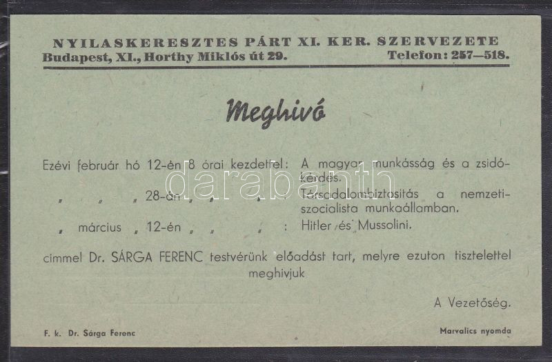 Nyilaskeresztes Párt használatlan meghívója https://www.darabanth.com/de/134-Fernauktion/134.0/Andere-Sammelgebiete/Drucksachen~195/Nyilaskeresztes-Part-hasznalatlan-meghivoja~II384460